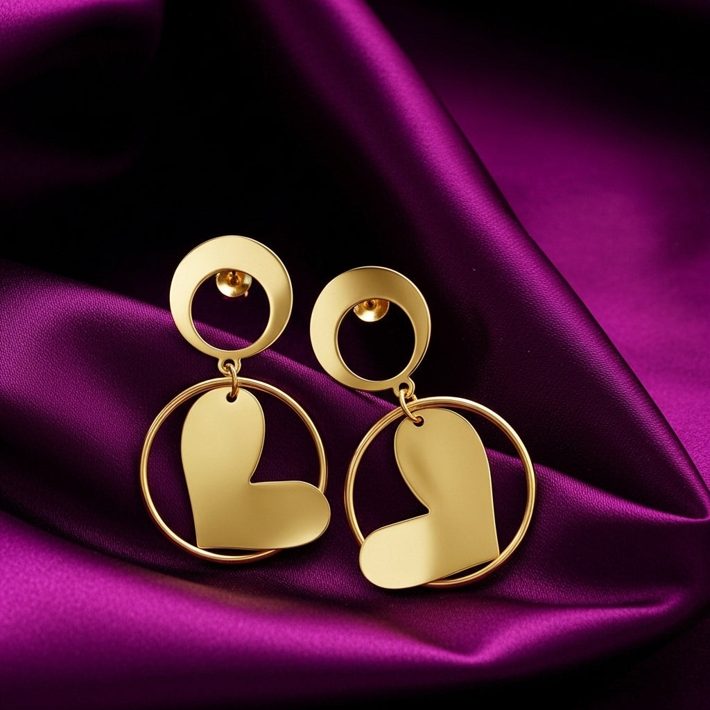 Amora Orbit Drop Earrings combine contemporary design with wearable elegance. Each earring features a polished gold-tone circular stud anchoring a suspended open ring that frames a softly contoured heart - a composition that balances geometric precision with organic curves. The lightweight open construction enables natural movement while the proportioned drop length ensures secure, effortless wear. Refined yet approachable, these earrings transition seamlessly across occasions, adding understated character to any ensemble without demanding attention.