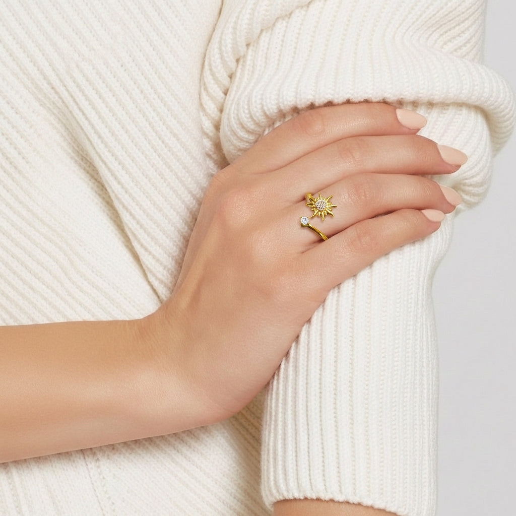 The Astra Whisper Statement Ring embodies understated elegance through its thoughtfully crafted design. Featuring a delicate star motif at its center with fine, light-catching details, this piece balances sculptural presence with everyday wearability. An asymmetrical curved element adds contemporary sophistication, while the warm gold finish creates a gentle luminosity. The open-ended silhouette ensures comfortable wear and versatile styling, making it an ideal accent for those who appreciate refined, minimalist jewelry that speaks through subtle craftsmanship rather than bold statements.