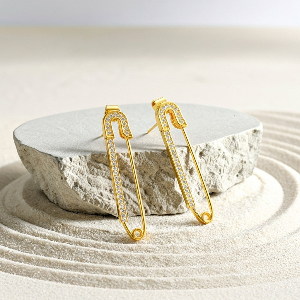 Aureline Pinform Stud Earrings redefine contemporary jewellery through architectural simplicity. Inspired by safety-pin geometry, these studs marry clean lines with refined elegance—a design that reads as both modern and timeless. The polished gold-tone finish provides a warm, versatile base, while a linear cascade of clear crystals introduces subtle luminosity and dimension. The structured silhouette balances a curved top with a vertical drop, creating visual interest without excess. Engineered as secure studs that deliver the visual impact of longer earrings, they transition effortlessly from daily wear to curated occasions. A confident choice for those who appreciate understated sophistication with an edge.