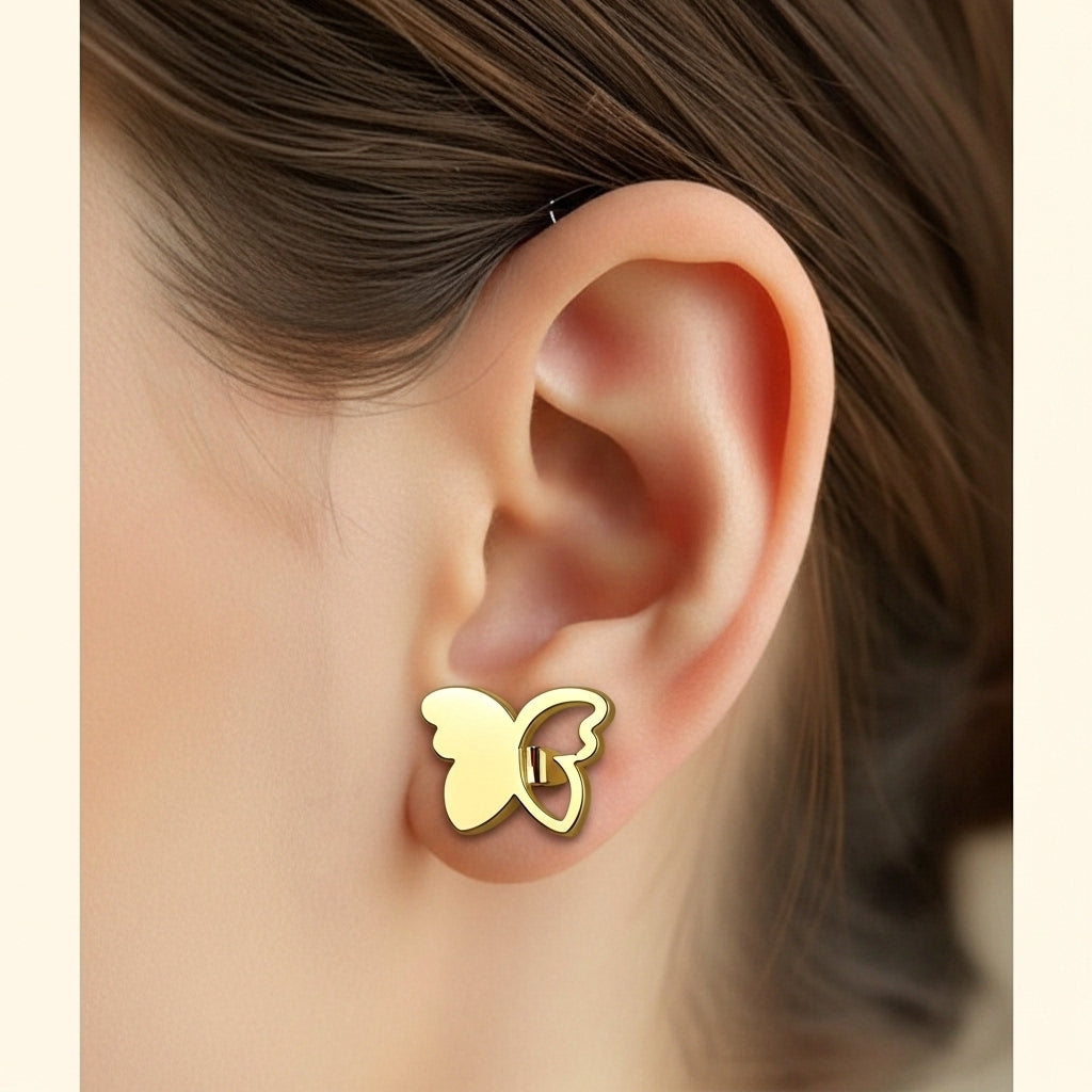 Crafted in a polished gold-tone finish, these Stud Earrings feature a clean butterfly outline with smooth, rounded contours. The minimal, high-shine surface enhances the sculpted form, allowing light to reflect gently across the curves. Free from stone embellishments, the design remains sleek and versatile, making them lightweight and comfortable for all-day office wear or casual outings.