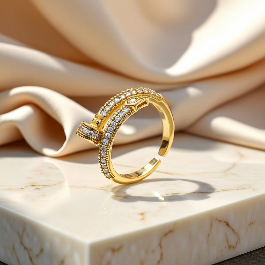 Crafted in a polished gold-tone finish, this Statement Ring features a gently curved band encrusted with fine crystals along the outer arc. Subtle textural detailing along the edges enhances its dimensional appeal, while the central bar accent adds a graphic focal point. The open cuff design allows for slight adjustability and ensures comfortable wear, making it suitable for long office hours, celebrations, or evening gatherings.