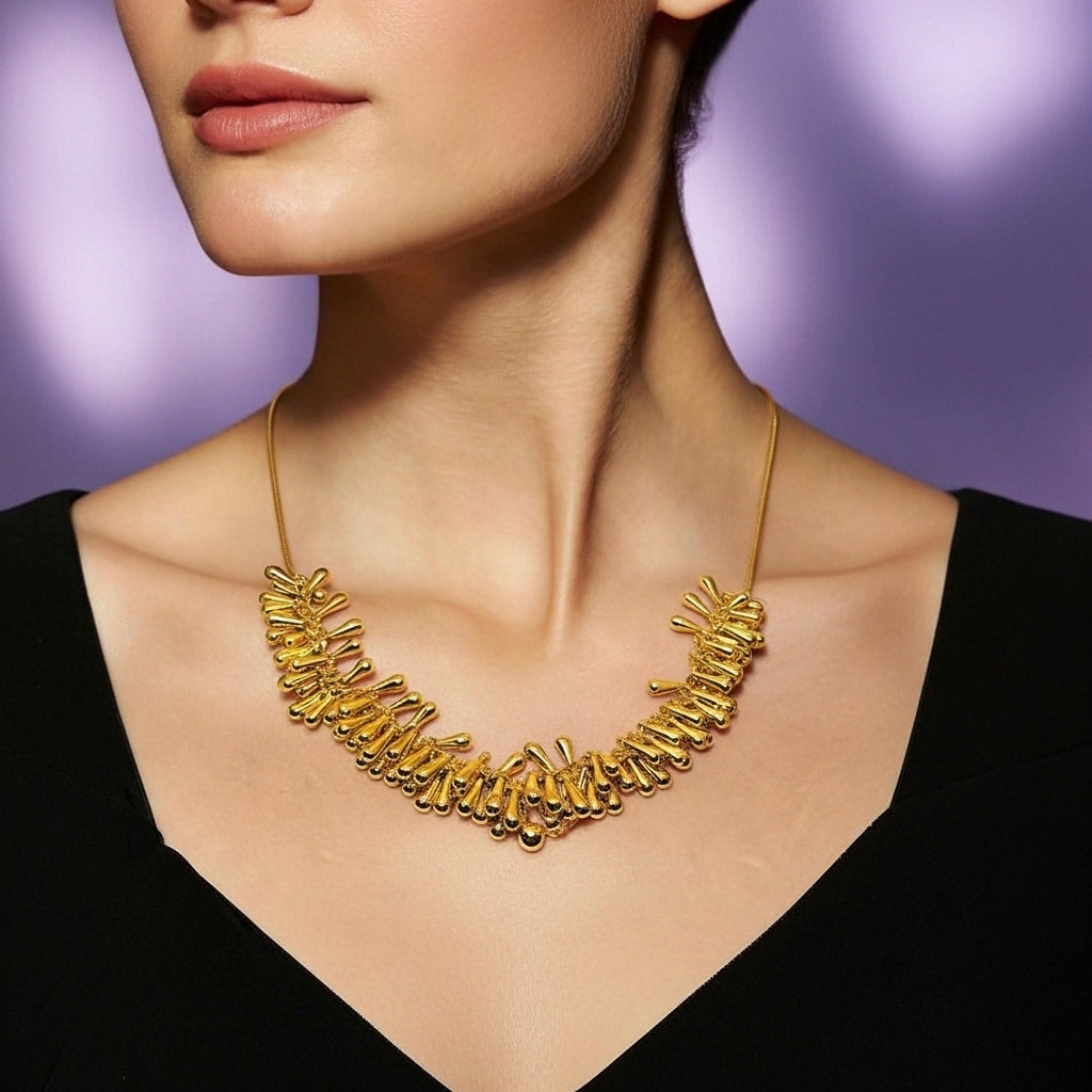 Sculptural and expressive, the Calythia Ripple Collar Necklace frames the neckline with refined movement and understated drama. Its organic yet intentional design delivers a modern statement that remains effortlessly wearable. Fluid, droplet-like elements arranged in rhythmic succession follow the natural curve of the collarbone, each softly rounded and finished in smooth, high-polish gold-tone for gentle light play. The clustered composition creates depth and texture without excess weight, while a flexible chain structure ensures comfortable wear and natural body adaptation. Balanced proportions provide security and presence, making this piece equally suited to layered styling or worn as a singular focal point.