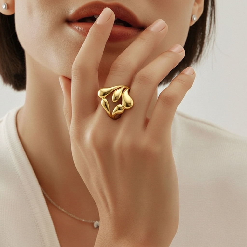 The Morrow Flux Statement Ring embodies sculptural design philosophy through its flowing, organic geometry. Featuring interconnected curves that layer seamlessly across the surface, this piece prioritizes form over ornamentation, delivering visual impact through dimensional silhouette alone. Polished to a luminous gold tone, the ring's rounded planes catch and reflect light, creating subtle movement as you wear it. The absence of sharp edges ensures comfort during extended wear, while balanced proportions maintain an effortless aesthetic that transitions seamlessly from day to evening. A statement piece that communicates confidence through restraint and considered design.