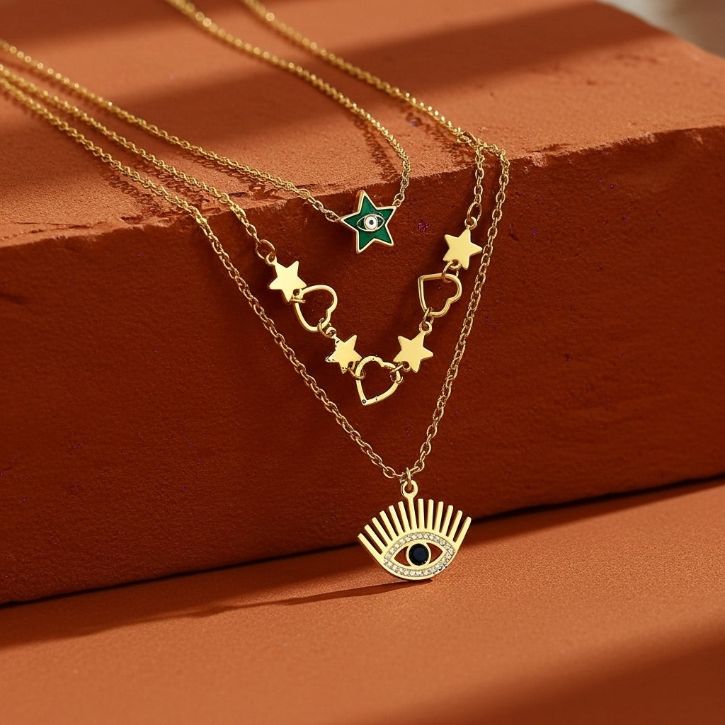 Distinctive yet thoughtfully restrained, the Noctyra Eye Pendant Necklace draws attention through meaningful design rather than ornamentation. The stylised eye motif—rendered with fine linear detailing that radiates outward—symbolises awareness and self-assurance, creating a modern focal point at the neckline. Crafted with precision, the pendant features a high-polish gold-tone finish that clarifies its balanced form, while a dark-toned central accent provides subtle contrast. Suspended from a delicate chain, it moves naturally against the skin, delivering comfort suitable for daily wear. Clean proportions and considered geometry ensure the piece reads as both contemporary and timeless, making it an intelligent addition to any jewellery collection.