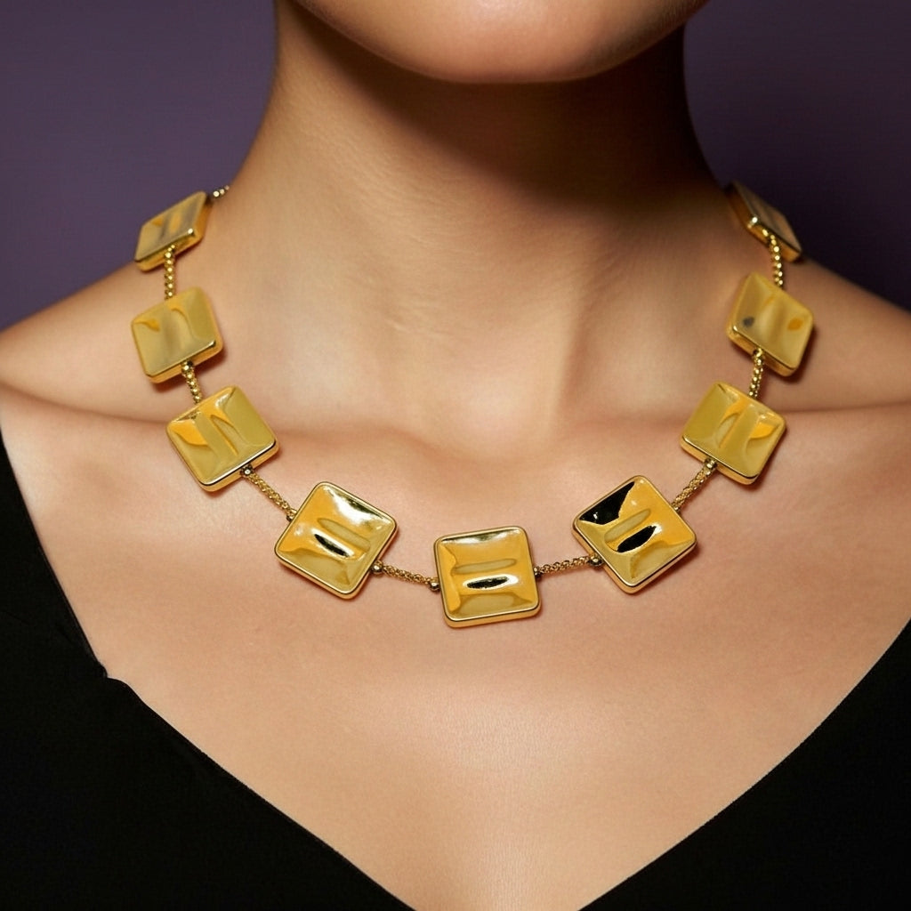Bold in structure yet composed in finish, the Solvane Mirror Tile Chain Necklace brings modern definition to your everyday style. This necklace features a sequence of softly contoured square tiles linked with delicate chain segments, allowing natural movement and flexibility. Each tile showcases a smooth, high-polish gold-tone surface with subtle undulations that catch light beautifully, creating dimension without excess ornamentation. The balanced spacing ensures an even, secure fit along the collarbone, while the articulated construction adapts comfortably to your movements throughout the day. A refined piece that bridges contemporary design with wearable sophistication.