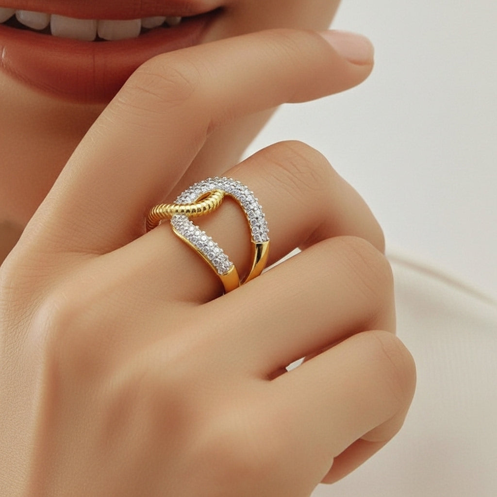 Crafted in a polished gold-tone finish, this Statement Ring features two crossing bands that wrap elegantly around the finger. One arc is encrusted with fine crystals, delivering soft, continuous shimmer, while the other showcases a textured, ribbed finish that adds depth and contrast. The overlapping design forms a dynamic knot-like structure, giving the ring architectural presence without appearing heavy. The open construction and smooth inner surface ensure comfort for extended office wear or evening occasions.